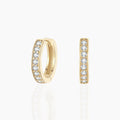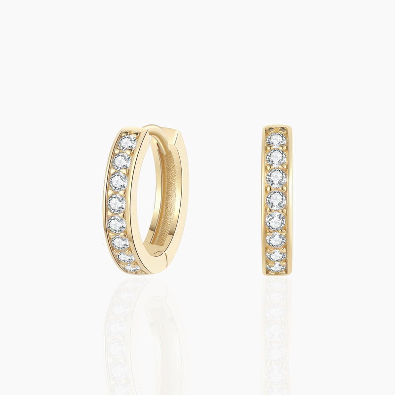 These beautiful hoop earrings feature glistening round moissanite stones in sophisticated shared prong settings.